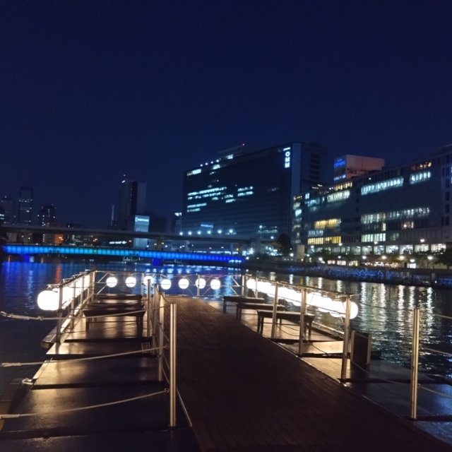 β本町橋から東横堀川水門までゆっくりと往復し、水辺プロジェクションマッピングを楽しむナイトクルーズ。β本町橋 shevaのドリンク付きクルーズをご用意しています。